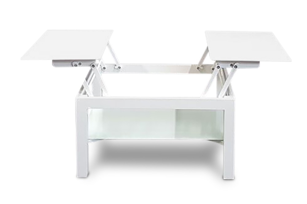 | Masse und Stückzahl | 1 x verstellbarer Tisch in weiss L 73.5 x B 59 x H 40 cm aufgeklappt: L 121.5 x B 59 H 58 cm inklusive Milchglasplatte |
