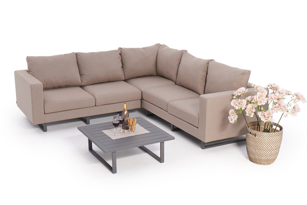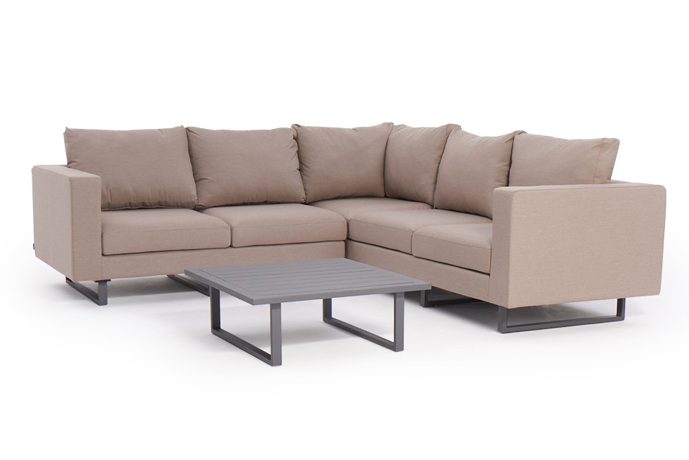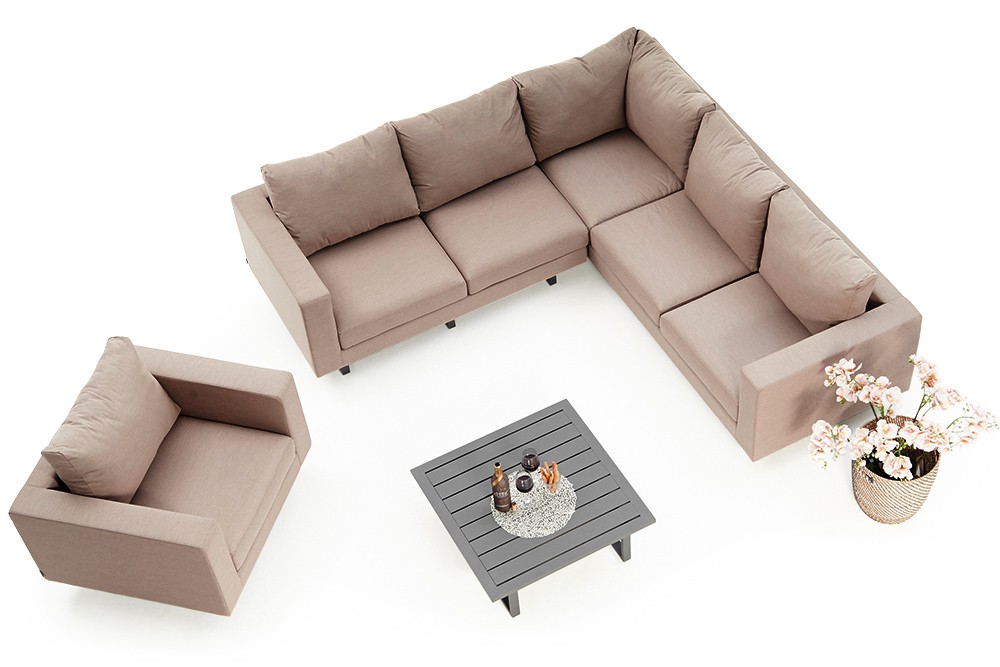 | Masse und Stückzahl | 1 x Outdoor 2er-Sofa L 150 x T 87 x H 66 cm 1 x Outdoor 3er-Sofa L 239 x T 87 x H 66 cm 1 x Chefsessel L 97 x T 89 x H 66 cm 1 x Coffee table aluminium L 70 x T 70 x H 30 cm Gesamtlänge der Ecklounge: L 239 x T 239 cm |