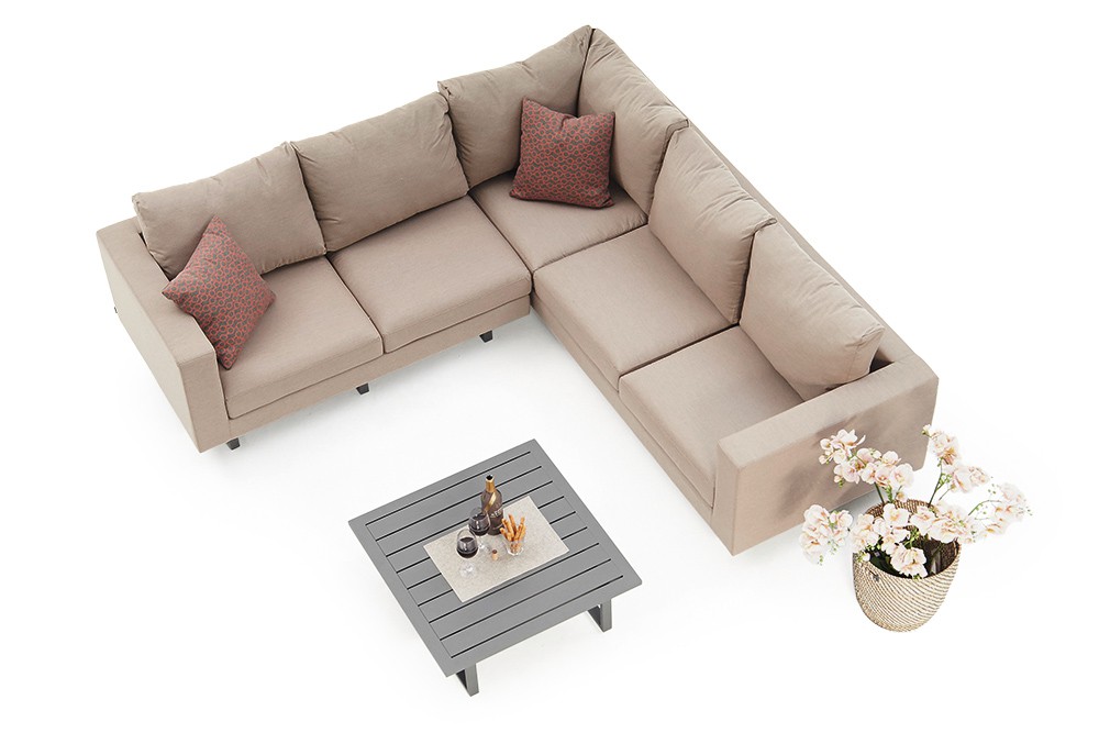 | Masse und Stückzahl | 1 x Outdoor 2er-Sofa L 150 x T 87 x H 66 cm 1 x Outdoor 3er-Sofa L 239 x T 87 x H 66 cm 1 x Coffee table aluminium L 70 x T 70 x H 30 cm Gesamtlänge der Ecklounge: L 239 x T 239 cm |
